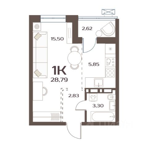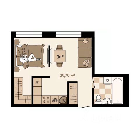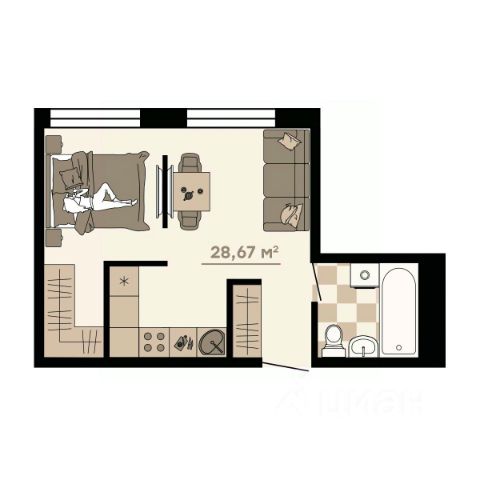 Компактность без потерь комфорта. 34,5 кв.м — это оптимальный размер для одного человека или молодой пары.