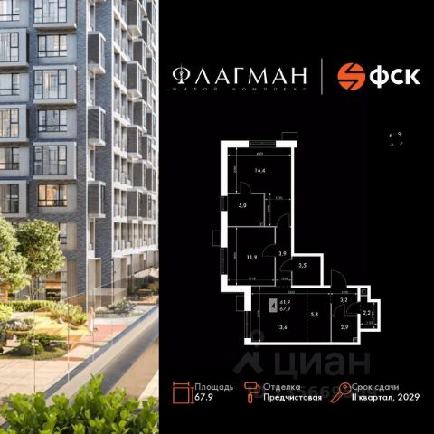 Квартиры от застройщика! Современный жилой комплекс комфорт-класса в развитом районе города. Продаётся 3-к квартира номер 253 общей площадью 67.9 кв.м. на 23-м этаже 30 этажного здания. Предчистовая отделка. Цена с учётом скидки. Особенности квартиры: - Угловая планировка - больше пространства для ваших идей. - Гостевой санузел - комфорт и удобство для ваших гостей. - Постирочная - организуйте пространство для стирки и сушки вещей. - Евроформат - просторное и удобное жилье с отличной планировкой. - Гардеробная - удобство для хранения и организации вещей. Квартира с предчистовой отделкой. Вам не придется заниматься черновыми и трудоёмкими работы, а чистовую отделку и дизайн - сделайте на свой вкус. Информация о комплексе: Жилой комплекс "Флагман" - это сочетание продуманной архитектуры, качественных материалов и развитой инфраструктуры. Проект реализован в едином архитектурном стиле: современные фасады, аккуратные линии и внимание к деталям формируют выразительный облик района. Закрытые дворы, озеленение и приватные пространства создают ощущение уюта и защищенности в городской среде. Комплекс расположен в районе с уже сложившейся социальной и коммерческой инфраструктурой, что делает его удобным для жизни без необходимости долгих поездок. Транспортная доступность: - 9 мин. пешком до детского сада - 7 мин. до школы - 5 мин. до взрослой поликлиники - 1 мин. до автобусной остановки Внутренняя инфраструктура: Территория проекта спроектирована с учетом повседневных сценариев жизни. Закрытые дворы оборудованы современными детскими и спортивными площадками. В домах предусмотрены колясочные и кладовые помещения. Входные группы выполнены на уровне земли без ступеней и пандусов, что обеспечивает комфорт для семей с детьми, пожилых людей и маломобильных жителей. Для автомобилистов предусмотрен одноэтажный паркинг с автоматической мойкой. На первых этажах домов размещены коммерческие помещения с магазинами и сервисами первой необходимости, формирующие удобную среду прямо у дома.