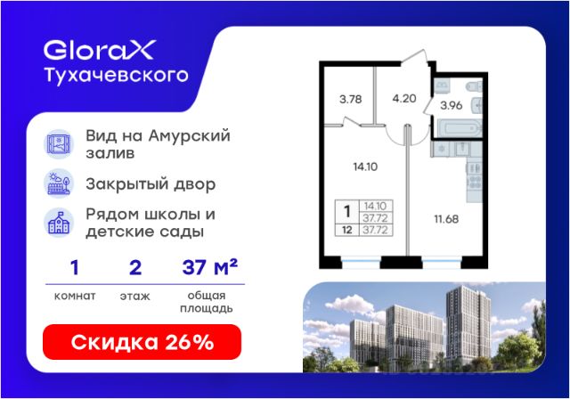 Продается 1-комн. квартира на 2-м этаже в жилом комплексе GloraX Тухачевского — современном проекте нового формата в престижном районе Владивостока. Общая площадь лота составляет 36,68 кв. м, из которых 14,10 кв. м отведено под жилую и 11,68 кв. м под кухонную зону. Номер квартиры - 229. Преимущества квартиры: однокомнатная квартира; гардеробная. Преимущества проекта: • Панорамный вид на Амурский залив и зелёные сопки • Удачное расположение и транспортная доступность: Первореченский район, 20 минут до центра города • Закрытая охраняемая территория с доступом только для жителей • Эксклюзивное благоустройство: продуманное зонирование, игровые и спортивные площадки, арт-инсталляция, Тайный сад • Безбарьерная среда, видеонаблюдений, Wi-Fi на территории • Премиальный дизайн входных групп реcепшн и лаунж-зоной • Лапомойки, колясочные и туалеты на первом этаже • Подземный паркинг на 449 машиномест с доступом на лифте с жилых этажей • Индивидуальные кладовые на цокольном этаже от 2 до 10 м2 GloraX Тухачевского — это городское пространство нового формата, которое позволяет современным горожанам находить все необходимые атрибуты комфортной жизни внутри своего жилого комплекса. Весь комплекс спроектирован так, чтобы жить здесь было удобно и безопасно: светлые лаунж-зоны и ресепшн на входах в жилые корпуса, эксклюзивный дизайн мест общего пользования и придомовой территории, круглосуточная охрана, видеонаблюдение и даже детский сад в одном из корпусов все, что необходимо современному городскому жителю. GloraX Тухачевского находится в одном из самых престижных районов города с хорошей, давно сформировавшейся инфраструктурой и отличной транспортной доступностью. Отсюда легко добраться до центра города, других районов и даже пригорода как на собственном транспорте, так и на общественном. Квартал имеет прямой выезд на ул. Тухачевского, а рядом с комплексом расположена автобусная остановка на несколько маршрутов. Проект состоит из 3 монолитных корпусов, объединенных единым стилобатом. В комплексе предусмотрены: подземный паркинг с лифтом на жилые этажи, кладовые для хранения, благоустроенный двор без машин, детские и спортивные площадки, зоны для отдыха и прогулок. Эксклюзивный проект благоустройства территории разработан одной из лучших студий ландшафтного дизайна DEREVOPARK с фокусом на комфорт и удобство для всех жителей комплекса. Вся необходимая инфраструктура — магазины, школы, детские сады, остановки общественного транспорта — находится рядом. Узнайте подробности и подберите свою квартиру в GloraX Тухачевского — в отделе продаж уже сегодня. Цена указана при 100% оплате или стандартной ипотеке. Узнайте подробности в Отделе продаж.