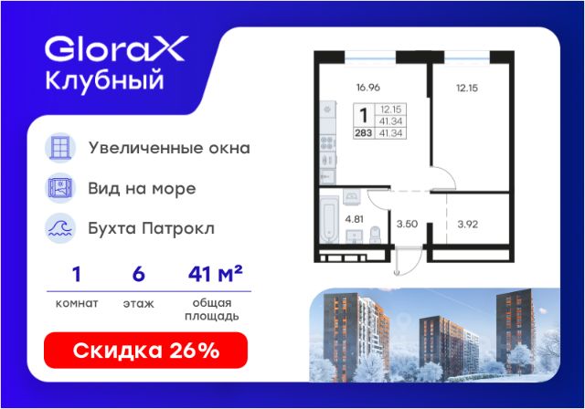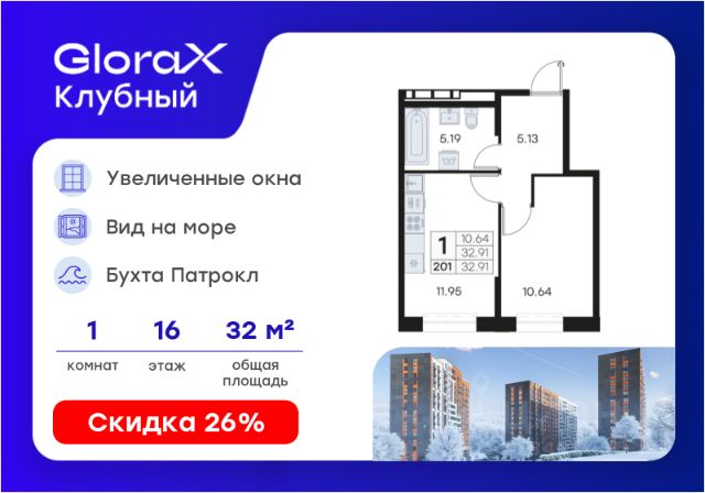 Продается 1-комн. квартира на 6-м этаже в квартале GloraX Клубный. GloraX Клубный - уникальный видовой проект с выделяющейся архитектурой в развитом районе Владивостока. Общая площадь лота составляет 32,46 кв. м, из которых 9,65 кв. м отведено под жилую и 11,93 кв. м под кухонную зону. Номер квартиры - 278. Преимущества квартиры: однокомнатная квартира. Преимущества проекта: • Квартиры с панорамными видами на бухту Патрокл, маяк Басаргина и остров Русский • Планировочные решения под любой жизненный сценарий от 23 до 67 м² • Гардеробные комнаты, увеличенные панорамные окна, просторные кухни-гостиные • Эксклюзивное благоустройство: продуманное зонирование, игровые и спортивные площадки, площадка для стритбола, амфитеатр • Премиальный дизайн входных групп с лаунж-зоной • Безбарьерная среда, закрытая территория, видеонаблюдение • Лапомойки, колясочные и туалеты на первом этаже • Двухуровневый подземный паркинг на 350 машино-мест с лифтом на жилые этажи • Келлеры на цокольном этаже для хранения сезонных вещей с доступом на лифте • Современный ландшафтный дизайн комплекса от DEREVOPARK GloraX Клубный заповедник в черте мегаполиса. Комплекс тщательно продуман для максимального удобства и обеспечения безопасности его жителей. Квартал расположен в одном из самых современных развивающихся районов города: совсем рядом раскинулась живописная бухта Патрокл, где можно прогуляться по облагороженной пешеходной набережной, заглянуть на пляж или в школу серфинга. Комплекс имеет прекрасную транспортную доступность: рядом проходит объездная трасса СеданкаПатрокл, а до центар можно доехать всего за 15 минут. Проект включает 3 монолитных корпуса, каждый из которых спроектирован с акцентом на комфорт, безопасность и современный образ жизни рядом с уникальной природой. Общий двор создает приватную территорию для житей комплекса. В комплексе предусмотрен двухуровневый подземный паркинг на 350 машино-мест с доступом прямо с жилых этажей. Паркинг оборудован современными системами видеонаблюдения, контроля въезда-выезда и пожаротушения. На цокольном этаже размещаются келлеры для хранения сезонных и габаритных вещей. Доступ к кладовым на лифте с жилых этажей. Современный ландшафтный дизайн жилого комплекса GloraX Клубный создан ведущей российской студией DEREVOPARK. Во дворе для детей всех возрастов предусмотрены различные игровые площадки с лазалками, батутами, качелями и песочницей. В центре расположен специальный "зеленый остров", где взрослые могут отдохнуть на качелях и гамаках в тени больших деревьев. Для любителей спорта предусмотрены две специальные спортивные площадки для настольного тенниса и стритбола — для зрителей тоже найдется место! А еще на территории комплекса будет дорожка для роллеров и любителей покататься на велосипеде, самокате или скейте. В шаговой доступности располагаются все необходимые объекты социальной и коммерческой инфраструктуры. Действуют скидки при определенных у