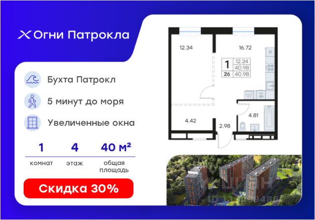 DNV-07-02-03-003-135 Эргономичная уютная студия в жилом комплексе "ДОМ на Востоке". Срок сдачи 3 кв. 2027 г. Монолитный дом. ДОМ на Востоке" жилой квартал с авторской архитектурой от известного бюро KAMEN, благоустроенной территорией и собственной развитой инфраструктурой. Это флагманский проект от государственного застройщика ДОМ.РФ Девелопмент, расположенного в сердце живописной бухты Патрокл. Проект находится в перспективном, быстроразвивающемся районе города со всей инфраструктурой на берегу залива. Всего 8 минут пешком и вы на Леопардовой набережной совершаете променад или любуетесь завораживающими закатами и рассветами. До центра города и крупных торговых центров легко добраться за 20 минут на автомобиле. Преимущества лота - Эргономичная планировка - Высокий потолок 2,9 м - Большая кухня-ниша - Просторная жилая зона - Корзина для кондиционера Отделка: Квартира сдается в черновой отделке. Инфраструктура На первых этажах домов будет все необходимое для жизни: магазины, кафе, аптеки, салоны красоты и многое другое. А для семей с детьми предусмотрены детские сады, безопасные игровые площадки и игровые комнаты. Паркинг: подземный отапливаемый с видеонаблюдением Для удобства жителей комплекса предусмотрен теплый паркинг в доме. Теперь не придется искать место для парковки, а также чистить автомобиль от снега или прогревать его в холодное время года. В паркинге также расположены кладовые помещения для хранения сезонных вещей и спортивного инвентаря. Условия покупки Продажа от надёжного государственного застройщика ДОМ.РФ Девелопмент с использованием эскроу-счетов. 100% оплата или ипотека. Сейчас действуют особые предложения по льготной ипотеке на период строительства. Продам 1-комнатную квартиру в дешевой новостройке в Владивостоке.