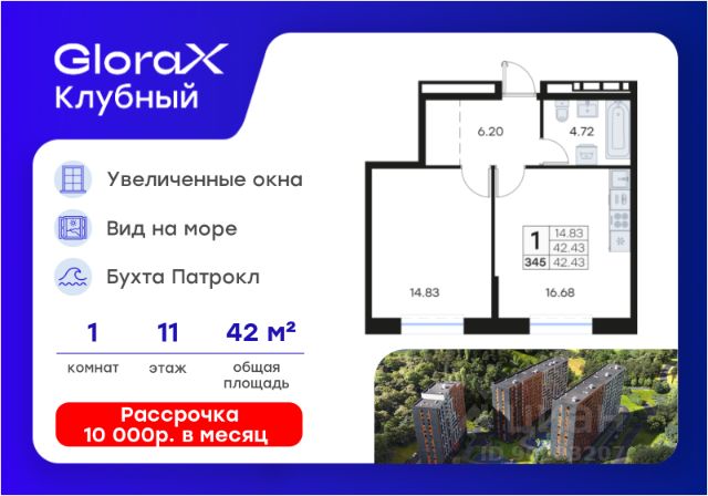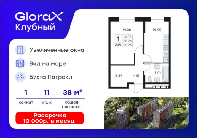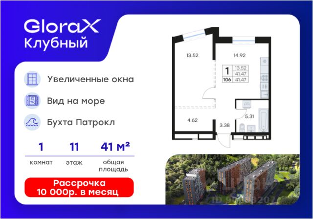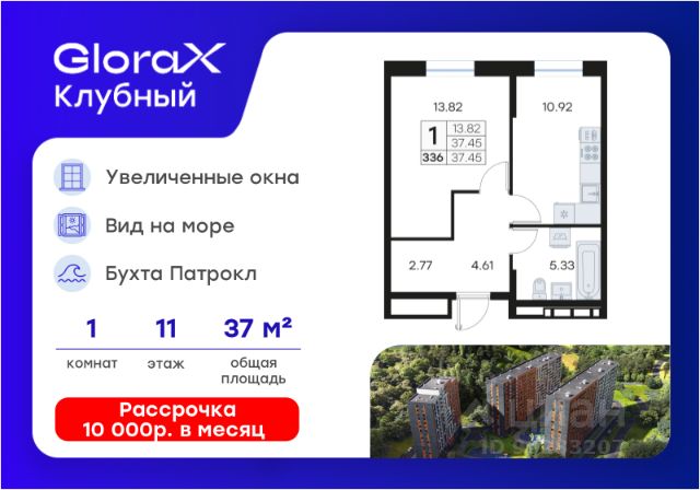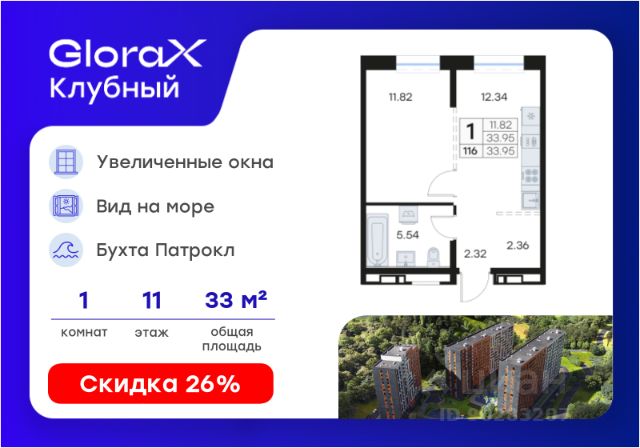 Продается 1-комн. квартира на 11-м этаже в квартале GloraX Клубный. GloraX Клубный - уникальный видовой проект с выделяющейся архитектурой в развитом районе Владивостока. Общая площадь лота составляет 34,90 кв. м, из которых 10,42 кв. м отведено под жилую и 11,95 кв. м под кухонную зону. Номер квартиры - 338.