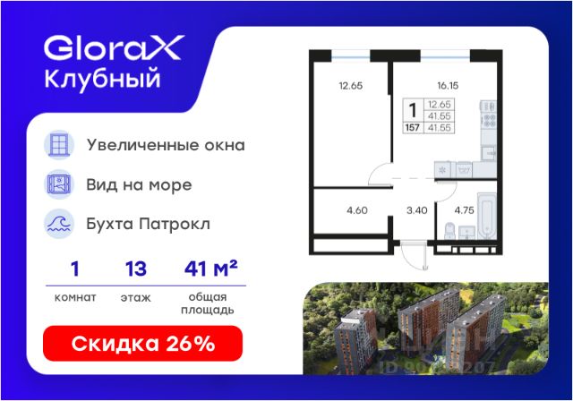 однокомнатная квартира; вид на море; высокий этаж; угловая.