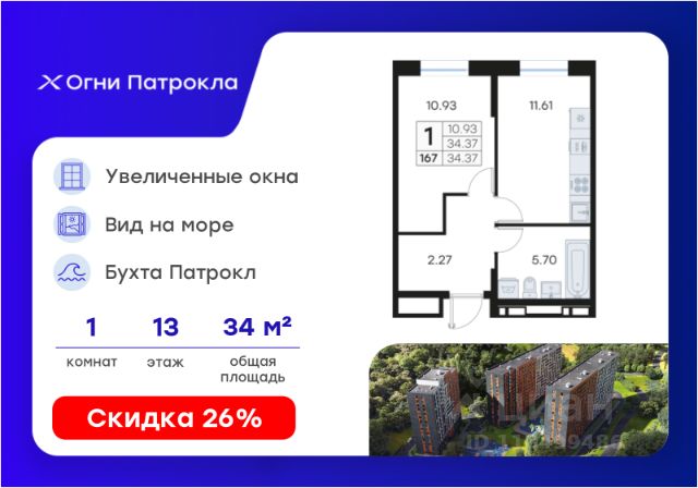 DNV-04-1.1-13-004-049 Светлая уютная студия с большим санузлом и предчистовой отделкой в жилом комплексе "ДОМ на Востоке". Общая площадь 26,1 м2. Срок сдачи 2 кв. 2026 г. Монолитный дом. "ДОМ на Востоке" жилой квартал с авторской архитектурой от известного бюро KAMEN, благоустроенной территорией и собственной развитой инфраструктурой. Это флагманский проект от государственного застройщика ДОМ.РФ Девелопмент, расположенного в сердце живописной бухты Патрокл. Проект находится в перспективном, быстроразвивающемся районе города со всей инфраструктурой на берегу залива. Всего 8 минут пешком и вы на Леопардовой набережной совершаете променад или любуетесь завораживающими закатами и рассветами. До центра города и крупных торговых центров легко добраться за 20 минут на автомобиле. Преимущества лота - Эргономичная планировка - Высокий потолок 2,9 м в чистоте - Большой совмещенный санузел 4,9 м2 - Корзина для кондиционера - Ниша для встроенного шкафа Отделка: В квартире будет выполнена предчистовая отделка. - Возведены перегородки из керамзита-цементных блоков - Оштукатурены стены - Выполнена стяжка пола - Произведена разводка трубопроводов, электричества, вентиляции и кондиционирования. Разводка отопления осуществляется внутри стяжки (горизонтальная), выводы под радиаторы выведены из стены. - Установлены радиаторы с терморегулятором - Выполнена шумоизоляция по полу - Установлены двухкамерные стеклопакеты и металлическая входная дверь - Заведен интернет кабель до слаботочного щита в квартире - Проведены коммуникации под установку кондиционера К моменту выдачи ключей все шумные работы будут завершены. Вам останется самая приятная часть ремонта выбор покрытия стен и пола, сантехники, мебели и аксессуаров. Инфраструктура На первых этажах домов будет все необходимое для жизни: магазины, кафе, аптеки, салоны красоты и многое другое. А для семей с детьми предусмотрены детские сады, безопасные игровые площадки и игровые комнаты. Паркинг: подземный отапливаемый с видеонаблюдением Для удобства жителей комплекса предусмотрен теплый паркинг в доме. Теперь не придется искать место для парковки, а также чистить автомобиль от снега или прогревать его в холодное время года. В паркинге также расположены кладовые помещения для хранения сезонных вещей и спортивного инвентаря. Условия покупки Продажа от надёжного государственного застройщика ДОМ.РФ Девелопмент с использованием эскроу-счетов. 100% оплата или ипотека. Сейчас действуют особые предложения по льготной ипотеке на период строительства. Купить 1-комнатную квартиру на 13 этаже в Владивостоке.