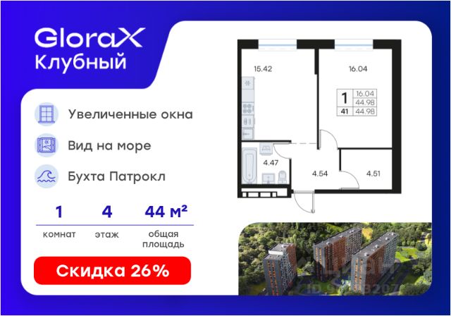 Продается 1-комн. квартира на 4-м этаже в квартале GloraX Клубный. GloraX Клубный - уникальный видовой проект с выделяющейся архитектурой в развитом районе Владивостока. Общая площадь лота составляет 42,59 кв. м, из которых 15,18 кв. м отведено под жилую и 16,34 кв. м под кухонную зону. Номер квартиры - 241.