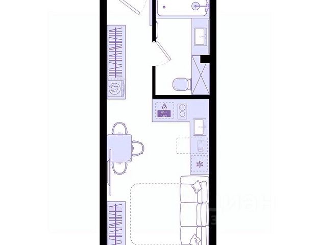 Гостиная оснащена: инверторным кондиционером "Haier", телевизором, регулирующимся под любой угол обзора, просторным диваном для отдыха, удобным и вместительным шкафом-купе.