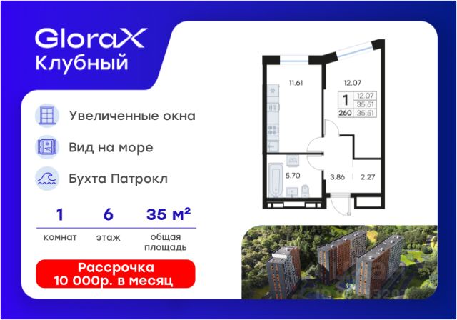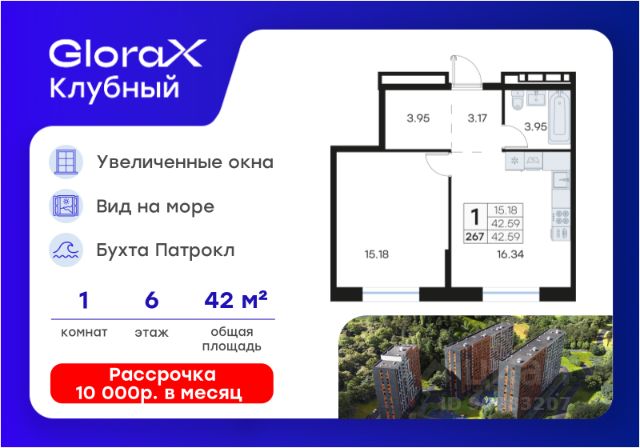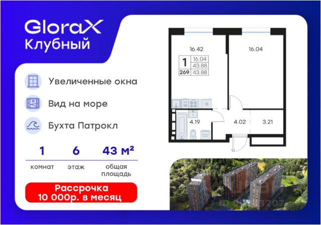 DNV-06-01-06-006-030 Современная 1-комнатная квартира классического формата с большой светлой гостиной в жилом комплексе "ДОМ на Востоке". Общая площадь 41,9 м2. Срок сдачи 3 кв. 2027 г. Монолитный дом. "ДОМ на Востоке" жилой квартал с авторской архитектурой от известного бюро KAMEN, благоустроенной территорией и собственной развитой инфраструктурой. Это флагманский проект от государственного застройщика ДОМ.РФ Девелопмент, расположенного в сердце живописной бухты Патрокл. Проект находится в перспективном, быстроразвивающемся районе города со всей инфраструктурой на берегу залива. Всего 8 минут пешком и вы на Леопардовой набережной совершаете променад или любуетесь завораживающими закатами и рассветами. До центра города и крупных торговых центров легко добраться за 20 минут на автомобиле. Преимущества лота - Высокий потолок 2,9 м - Гардеробная комната - Большая кухня - Радиусное остекление панорамные виды - Повышенная инсоляция - 4 окна в кухне-гостиной - 2 корзины для кондиционера Отделка: Квартира сдается в черновой отделке. Инфраструктура На первых этажах домов будет все необходимое для жизни: магазины, кафе, аптеки, салоны красоты и многое другое. А для семей с детьми предусмотрены детские сады, безопасные игровые площадки и игровые комнаты. Паркинг: подземный отапливаемый с видеонаблюдением Для удобства жителей комплекса предусмотрен теплый паркинг в доме. Теперь не придется искать место для парковки, а также чистить автомобиль от снега или прогревать его в холодное время года. В паркинге также расположены кладовые помещения для хранения сезонных вещей и спортивного инвентаря. Условия покупки Продажа от надёжного государственного застройщика ДОМ.РФ Девелопмент с использованием эскроу-счетов. 100% оплата или ипотека. Сейчас действуют особые предложения по льготной ипотеке на период строительства.