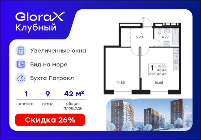 Продается 1-комн. квартира на 9-м этаже в квартале GloraX Клубный. GloraX Клубный - уникальный видовой проект с выделяющейся архитектурой в развитом районе Владивостока. Общая площадь лота составляет 43,04 кв. м, из которых 16,78 кв. м отведено под жилую и 11,61 кв. м под кухонную зону. Номер квартиры - 298.