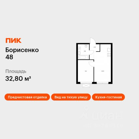 Продаётся 1-комн. квартира площадью 32,7 кв.м на 3 этаже 28 этажного дома (Корпус 2, Секция 2) проекта ПИК Борисенко 48. Светлый просторный подъезд на уровне земли, функциональная планировка, большие окна, предчистовая отделка. "Борисенко 48" - небольшой квартал в Первомайском районе, в 15 минутах пути на автомобиле от центра Владивостока. С верхних этажей откроется живописный вид на город и сопки. В проекте всего четыре дома и подземный паркинг, в который можно будет спуститься на лифте. Высота домов от 17 до 30 этажей - благодаря переменной этажности солнце будет лучше освещать двор и квартиры. На первых этажах откроются пекарни, кафе, магазины и другие сервисы - это удобно, когда внезапно закончится хлеб или захочется побаловать себя горячим кофе. Из каждого дома будет выход в уютный двор-парк - это закрытая территория для отдыха, где растут цветы и деревья, оборудованы детские и спортивные площадки. Рядом с "Борисенко 48" появится также детский сад для 150 малышей. В пешей доступности есть всё необходимое для комфортной жизни: школы, детские сады, поликлиника и магазины. До крупных торговых центров "Калина Молл" и "Луговая", а также супермаркета "Реми" - всего 5 минут на машине. А до озера на Сафонова, которое отлично подходит для прогулок и отдыха, можно дойти пешком за 9 минут. Живописная Леопардовая набережная - в 10 минутах на автомобиле. Из квартала можно будет выехать как на улицу Борисенко, так и на улицу Сафонова. Артикул 918261 (Застройщик ООО "СЗ "Юстина")
