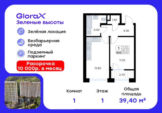 Продается 1-комн. квартира на 1-м этаже в жилом квартале GloraX Зелёные высоты — проекте в тихой зелёной локации. Общая площадь квартиры 39,40 кв. м, из которых 11,20 кв. м включая 11,20 кв. м жилого пространства и 13,80 кв. м кухни. Номер квартиры - 505.