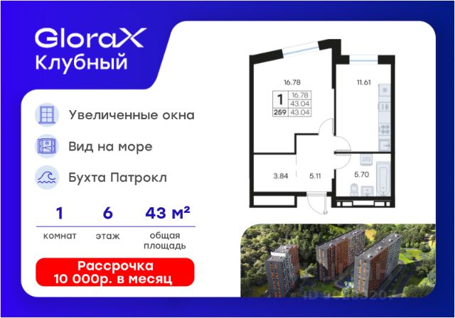 Продается 1-комн. квартира на 10-м этаже в квартале GloraX Клубный. GloraX Клубный - уникальный видовой проект с выделяющейся архитектурой в развитом районе Владивостока. Общая площадь лота составляет 43,89 кв. м, из которых 16,04 кв. м отведено под жилую и 16,42 кв. м под кухонную зону. Номер квартиры - 119. Преимущества квартиры: евро-двухкомнатная квартира; гардеробная. Преимущества проекта: • Квартиры с панорамными видами на бухту Патрокл, маяк Басаргина и остров Русский • Планировочные решения под любой жизненный сценарий от 23 до 67 м² • Гардеробные комнаты, увеличенные панорамные окна, просторные кухни-гостиные • Эксклюзивное благоустройство: продуманное зонирование, игровые и спортивные площадки, площадка для стритбола, амфитеатр • Премиальный дизайн входных групп с лаунж-зоной • Безбарьерная среда, закрытая территория, видеонаблюдение • Лапомойки, колясочные и туалеты на первом этаже • Двухуровневый подземный паркинг на 350 машино-мест с лифтом на жилые этажи • Келлеры на цокольном этаже для хранения сезонных вещей с доступом на лифте • Современный ландшафтный дизайн комплекса от DEREVOPARK GloraX Клубный заповедник в черте мегаполиса. Комплекс тщательно продуман для максимального удобства и обеспечения безопасности его жителей. Квартал расположен в одном из самых современных развивающихся районов города: совсем рядом раскинулась живописная бухта Патрокл, где можно прогуляться по облагороженной пешеходной набережной, заглянуть на пляж или в школу серфинга. Комплекс имеет прекрасную транспортную доступность: рядом проходит объездная трасса СеданкаПатрокл, а до центар можно доехать всего за 15 минут. Проект включает 3 монолитных корпуса, каждый из которых спроектирован с акцентом на комфорт, безопасность и современный образ жизни рядом с уникальной природой. Общий двор создает приватную территорию для житей комплекса. В комплексе предусмотрен двухуровневый подземный паркинг на 350 машино-мест с доступом прямо с жилых этажей. Паркинг оборудован современными системами видеонаблюдения, контроля въезда-выезда и пожаротушения. На цокольном этаже размещаются келлеры для хранения сезонных и габаритных вещей. Доступ к кладовым на лифте с жилых этажей. Современный ландшафтный дизайн жилого комплекса GloraX Клубный создан ведущей российской студией DEREVOPARK. Во дворе для детей всех возрастов предусмотрены различные игровые площадки с лазалками, батутами, качелями и песочницей. В центре расположен специальный "зеленый остров", где взрослые могут отдохнуть на качелях и гамаках в тени больших деревьев. Для любителей спорта предусмотрены две специальные спортивные площадки для настольного тенниса и стритбола — для зрителей тоже найдется место! А еще на территории комплекса будет дорожка для роллеров и любителей покататься на велосипеде, самокате или скейте. В шаговой доступности располагаются все необходимые объекты социальной и коммерческой инфраструктуры. Цена указана пр Есть лифт. Адрес: Приморский край, Владивосток, Катерная улица, 31/2
