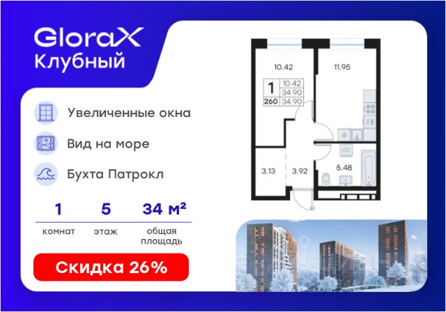 Продается 1-комн. квартира на 5-м этаже в квартале GloraX Клубный. GloraX Клубный - уникальный видовой проект с выделяющейся архитектурой в развитом районе Владивостока. Общая площадь лота составляет 34,90 кв. м, из которых 10,42 кв. м отведено под жилую и 11,95 кв. м под кухонную зону. Номер квартиры - 260.