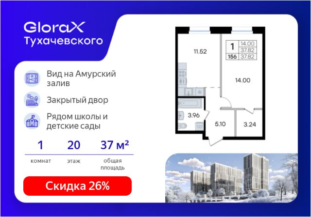 Продается 1-комн. квартира на 20-м этаже в жилом комплексе GloraX Тухачевского — современном проекте нового формата в престижном районе Владивостока. Общая площадь лота составляет 37,82 кв. м, из которых 14,00 кв. м отведено под жилую и 11,52 кв. м под кухонную зону. Номер квартиры - 156. Преимущества квартиры: однокомнатная квартира; высокий этаж; гардеробная. Преимущества проекта: • Панорамный вид на Амурский залив и зелёные сопки • Удачное расположение и транспортная доступность: Первореченский район, 20 минут до центра города • Закрытая охраняемая территория с доступом только для жителей • Эксклюзивное благоустройство: продуманное зонирование, игровые и спортивные площадки, арт-инсталляция, Тайный сад • Безбарьерная среда, видеонаблюдений, Wi-Fi на территории • Премиальный дизайн входных групп реcепшн и лаунж-зоной • Лапомойки, колясочные и туалеты на первом этаже • Подземный паркинг на 449 машиномест с доступом на лифте с жилых этажей • Индивидуальные кладовые на цокольном этаже от 2 до 10 м2 GloraX Тухачевского — это городское пространство нового формата, которое позволяет современным горожанам находить все необходимые атрибуты комфортной жизни внутри своего жилого комплекса. Весь комплекс спроектирован так, чтобы жить здесь было удобно и безопасно: светлые лаунж-зоны и ресепшн на входах в жилые корпуса, эксклюзивный дизайн мест общего пользования и придомовой территории, круглосуточная охрана, видеонаблюдение и даже детский сад в одном из корпусов все, что необходимо современному городскому жителю. GloraX Тухачевского находится в одном из самых престижных районов города с хорошей, давно сформировавшейся инфраструктурой и отличной транспортной доступностью. Отсюда легко добраться до центра города, других районов и даже пригорода как на собственном транспорте, так и на общественном. Квартал имеет прямой выезд на ул. Тухачевского, а рядом с комплексом расположена автобусная остановка на несколько маршрутов. Проект состоит из 3 монолитных корпусов, объединенных единым стилобатом. В комплексе предусмотрены: подземный паркинг с лифтом на жилые этажи, кладовые для хранения, благоустроенный двор без машин, детские и спортивные площадки, зоны для отдыха и прогулок. Эксклюзивный проект благоустройства территории разработан одной из лучших студий ландшафтного дизайна DEREVOPARK с фокусом на комфорт и удобство для всех жителей комплекса. Вся необходимая инфраструктура — магазины, школы, детские сады, остановки общественного транспорта — находится рядом. Узнайте подробности и подберите свою квартиру в GloraX Тухачевского — в отделе продаж уже сегодня. Цена указана при 100% оплате или стандартной ипотеке без субсидий. Узнайте подробности в Отделе продаж.