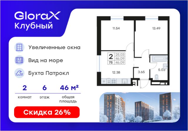 Продается 2-комн. квартира на 7-м этаже в квартале GloraX Клубный. GloraX Клубный - уникальный видовой проект с выделяющейся архитектурой в развитом районе Владивостока. Общая площадь лота составляет 45,63 кв. м, из которых 23,65 кв. м отведено под жилую и 12,09 кв. м под кухонную зону. Номер квартиры - 274.