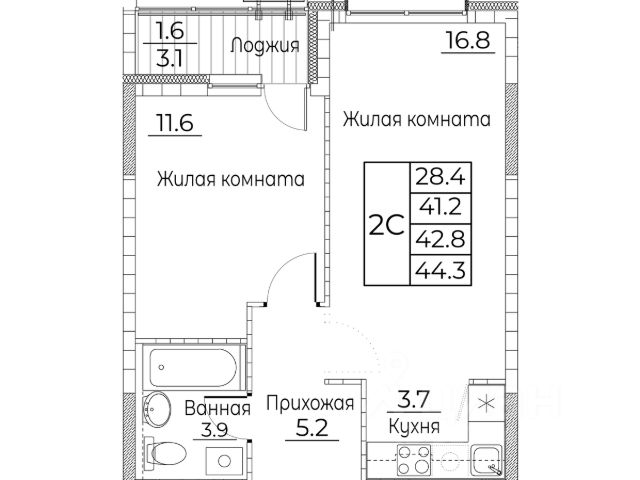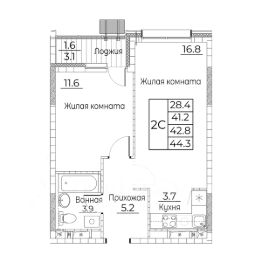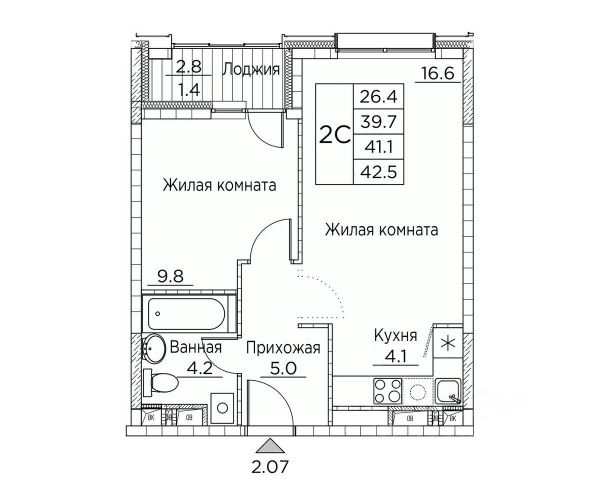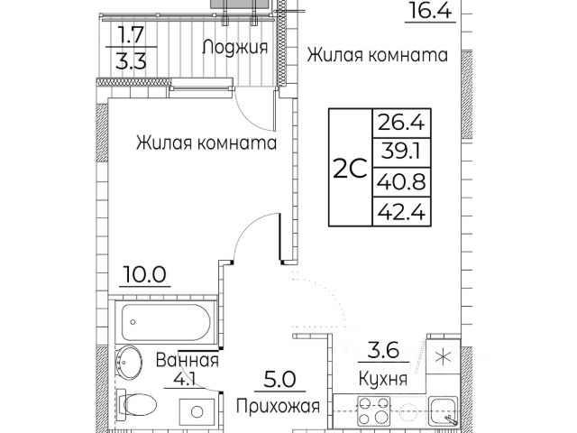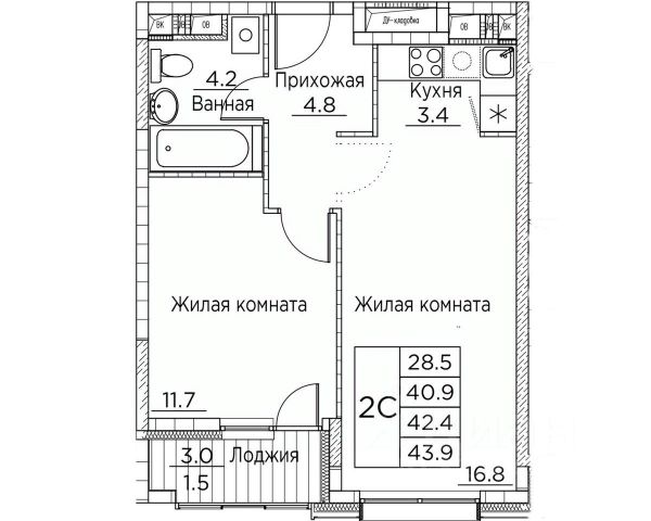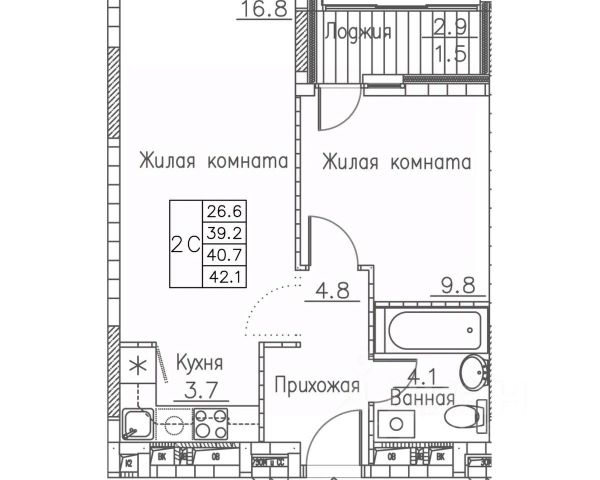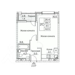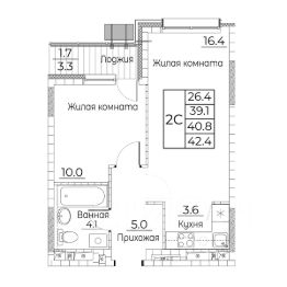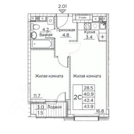 Общая площадь квартиры — 42.5 кв. м, этаж 13 из 21.