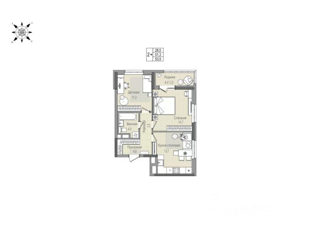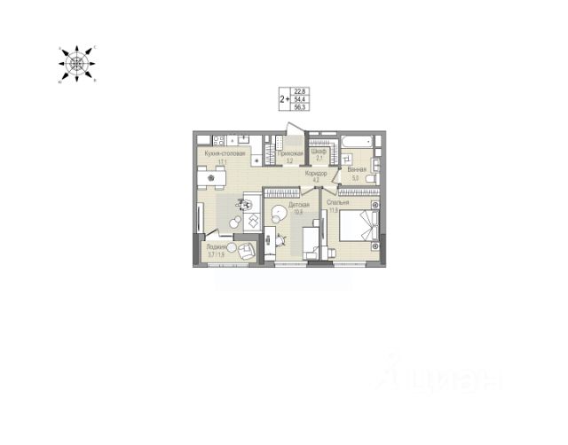 2,5-комнатная с мастер-спальней комфорт для всей семьи Прихожая 3,6 кв.м с местом для шкафа Просторная кухня-столовая 18,2 кв.м с лоджией подойдет как для тихих семейных вечеров за просмотром фильмов в домашнем кинотеатре, так и для шумного приема гостей Уютная детская 14,3 кв.м, где можно грамотно разделить зоны для занятий и отдыха Спальня 13,7 кв.м с собственной ванной комнатой максимальный комфорт для родителей Общая ванная комната 4,3 кв.м с местом под стиральную машину