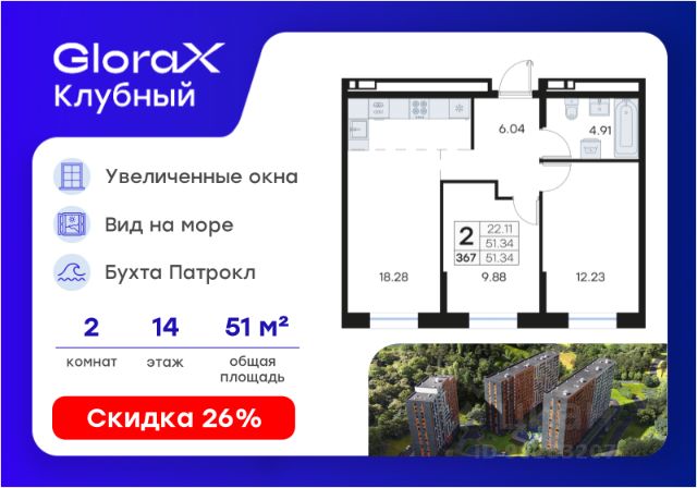Продается 2-комн. квартира на 14-м этаже в квартале GloraX Клубный. GloraX Клубный - уникальный видовой проект с выделяющейся архитектурой в развитом районе Владивостока. Общая площадь лота составляет 45,63 кв. м, из которых 23,65 кв. м отведено под жилую и 12,09 кв. м под кухонную зону. Номер квартиры - 365.