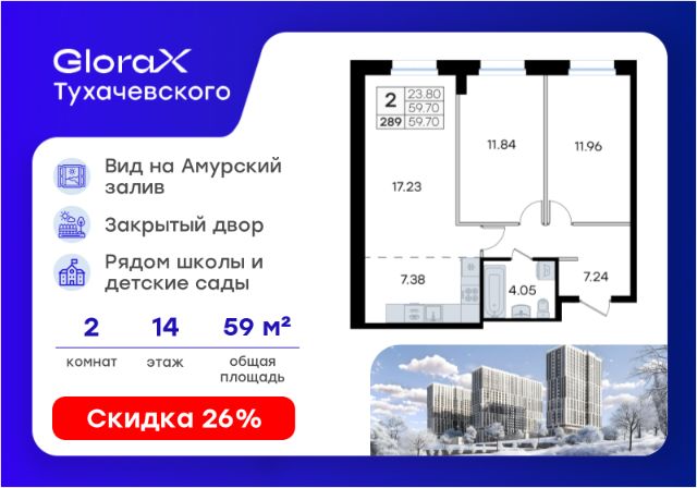 Продается 2-комн. квартира на 14-м этаже в жилом комплексе GloraX Тухачевского — современном проекте нового формата в престижном районе Владивостока. Общая площадь лота составляет 59,58 кв. м, из которых 23,80 кв. м отведено под жилую и 7,38 кв. м под кухонную зону. Номер квартиры - 125.