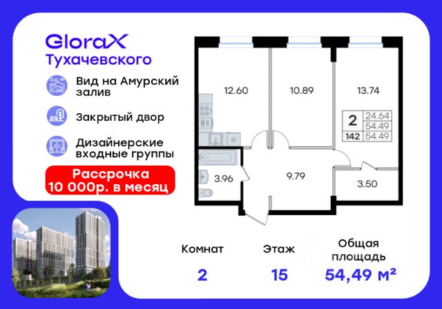 Продается 2-комн. квартира на 15-м этаже в жилом комплексе GloraX Тухачевского — современном проекте нового формата в престижном районе Владивостока. Общая площадь лота составляет 52,61 кв. м, из которых 24,16 кв. м отведено под жилую и 16,32 кв. м под кухонную зону. Номер квартиры - 138.