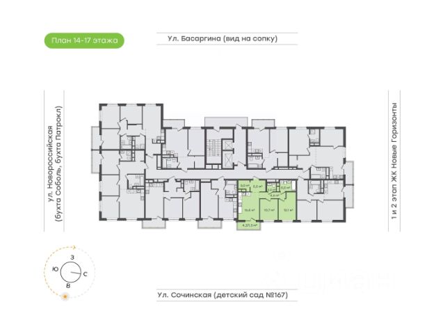 Общая площадь квартиры — 44.1 кв. м, этаж 15 из 22.