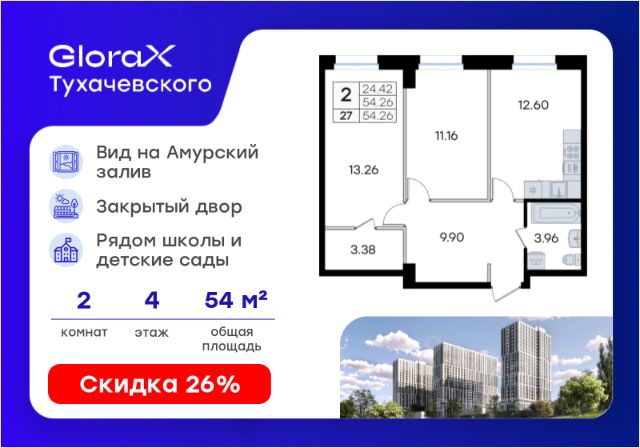 Продается 2-комн. квартира на 4-м этаже в жилом комплексе GloraX Тухачевского — современном проекте нового формата в престижном районе Владивостока. Общая площадь лота составляет 59,63 кв. м, из которых 23,97 кв. м отведено под жилую и 7,38 кв. м под кухонную зону. Номер квартиры - 30. Преимущества квартиры: двухкомнатная квартира. Преимущества проекта: • Панорамный вид на Амурский залив и зелёные сопки • Удачное расположение и транспортная доступность: Первореченский район, 20 минут до центра города • Закрытая охраняемая территория с доступом только для жителей • Эксклюзивное благоустройство: продуманное зонирование, игровые и спортивные площадки, арт-инсталляция, Тайный сад • Безбарьерная среда, видеонаблюдений, Wi-Fi на территории • Премиальный дизайн входных групп реcепшн и лаунж-зоной • Лапомойки, колясочные и туалеты на первом этаже • Подземный паркинг на 449 машиномест с доступом на лифте с жилых этажей • Индивидуальные кладовые на цокольном этаже от 2 до 10 м2 GloraX Тухачевского — это городское пространство нового формата, которое позволяет современным горожанам находить все необходимые атрибуты комфортной жизни внутри своего жилого комплекса. Весь комплекс спроектирован так, чтобы жить здесь было удобно и безопасно: светлые лаунж-зоны и ресепшн на входах в жилые корпуса, эксклюзивный дизайн мест общего пользования и придомовой территории, круглосуточная охрана, видеонаблюдение и даже детский сад в одном из корпусов все, что необходимо современному городскому жителю. GloraX Тухачевского находится в одном из самых престижных районов города с хорошей, давно сформировавшейся инфраструктурой и отличной транспортной доступностью. Отсюда легко добраться до центра города, других районов и даже пригорода как на собственном транспорте, так и на общественном. Квартал имеет прямой выезд на ул. Тухачевского, а рядом с комплексом расположена автобусная остановка на несколько маршрутов. Проект состоит из 3 монолитных корпусов, объединенных единым стилобатом. В комплексе предусмотрены: подземный паркинг с лифтом на жилые этажи, кладовые для хранения, благоустроенный двор без машин, детские и спортивные площадки, зоны для отдыха и прогулок. Эксклюзивный проект благоустройства территории разработан одной из лучших студий ландшафтного дизайна DEREVOPARK с фокусом на комфорт и удобство для всех жителей комплекса. Вся необходимая инфраструктура — магазины, школы, детские сады, остановки общественного транспорта — находится рядом. Узнайте подробности и подберите свою квартиру в GloraX Тухачевского — в отделе продаж уже сегодня. Цена указана при 100% оплате или стандартной ипотеке. Узнайте подробности в Отделе продаж.