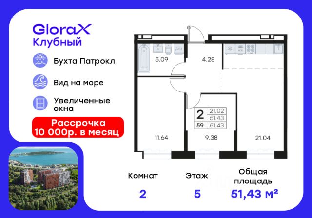 Продается 2-комн. квартира на 5-м этаже в квартале GloraX Клубный. GloraX Клубный - уникальный видовой проект с выделяющейся архитектурой в развитом районе Владивостока. Общая площадь лота составляет 51,58 кв. м, из которых 20,61 кв. м отведено под жилую и 20,68 кв. м под кухонную зону. Номер квартиры - 264.