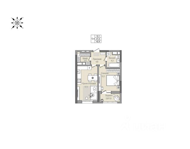 Комфортное пространство для жизни и отдыха Кухня-столовая 17,1 кв.м это идеальное место для приготовления вкусной еды и уютных посиделок за столом в кругу семьи и друзей Просторная прихожая 4,6 кв.м с гардеробной 3 кв.м, где удобно организовать хранение вещей Спальня 12,1 кв.м с выходом на лоджию - это уютный уголок, где можно наслаждаться утренним кофе с прекрасным видом Ванная 4,3 кв.м с местом под стиральную машину