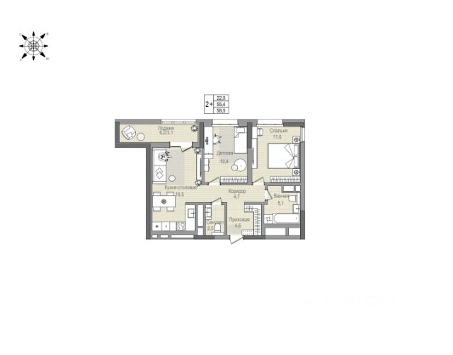 Просторная прихожая 4,7 кв.м с местом для гардероба и зоной для обуви, которая создает порядок и комфорт в квартире Кухня-гостиная 16,4 кв.м с выходом на лоджию создает комфортное пространство для приготовления еды и приятного времяпровождения в кругу семьи Увеличенная лоджия 6,2 кв.м, где можно наслаждаться свежим воздухом и красивыми панорамами Уютная спальня 11,6 кв.м для отдыха родителей после рабочего дня Удобная детская комната 10,5 кв.м для игр и занятий Два раздельных санузла для комфорта гостей и всей семьи