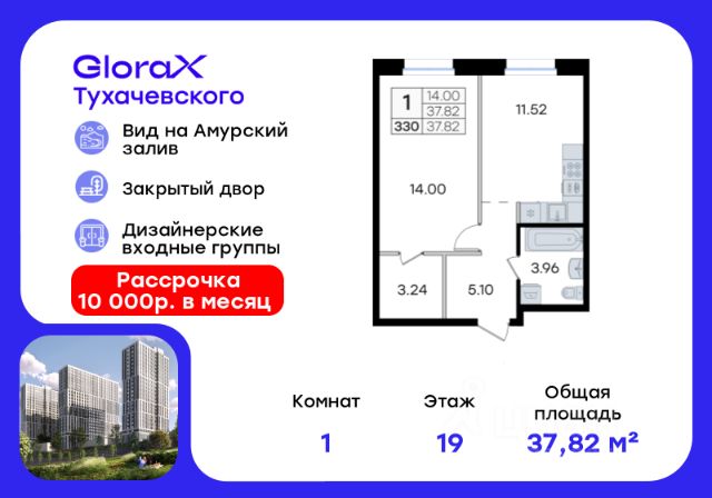 Продается 1-комн. квартира на 19-м этаже в жилом комплексе GloraX Тухачевского — современном проекте нового формата в престижном районе Владивостока. Общая площадь лота составляет 37,82 кв. м, из которых 14,00 кв. м отведено под жилую и 11,52 кв. м под кухонную зону. Номер квартиры - 330. Преимущества квартиры: однокомнатная квартира; высокий этаж; гардеробная. Преимущества проекта: • Панорамный вид на Амурский залив и зелёные сопки • Удачное расположение и транспортная доступность: Первореченский район, 20 минут до центра города • Закрытая охраняемая территория с доступом только для жителей • Эксклюзивное благоустройство: продуманное зонирование, игровые и спортивные площадки, арт-инсталляция, Тайный сад • Безбарьерная среда, видеонаблюдений, Wi-Fi на территории • Премиальный дизайн входных групп реcепшн и лаунж-зоной • Лапомойки, колясочные и туалеты на первом этаже • Подземный паркинг на 449 машиномест с доступом на лифте с жилых этажей • Индивидуальные кладовые на цокольном этаже от 2 до 10 м2 GloraX Тухачевского — это городское пространство нового формата, которое позволяет современным горожанам находить все необходимые атрибуты комфортной жизни внутри своего жилого комплекса. Весь комплекс спроектирован так, чтобы жить здесь было удобно и безопасно: светлые лаунж-зоны и ресепшн на входах в жилые корпуса, эксклюзивный дизайн мест общего пользования и придомовой территории, круглосуточная охрана, видеонаблюдение и даже детский сад в одном из корпусов все, что необходимо современному городскому жителю. GloraX Тухачевского находится в одном из самых престижных районов города с хорошей, давно сформировавшейся инфраструктурой и отличной транспортной доступностью. Отсюда легко добраться до центра города, других районов и даже пригорода как на собственном транспорте, так и на общественном. Квартал имеет прямой выезд на ул. Тухачевского, а рядом с комплексом расположена автобусная остановка на несколько маршрутов. Проект состоит из 3 монолитных корпусов, объединенных единым стилобатом. В комплексе предусмотрены: подземный паркинг с лифтом на жилые этажи, кладовые для хранения, благоустроенный двор без машин, детские и спортивные площадки, зоны для отдыха и прогулок. Эксклюзивный проект благоустройства территории разработан одной из лучших студий ландшафтного дизайна DEREVOPARK с фокусом на комфорт и удобство для всех жителей комплекса. Вся необходимая инфраструктура — магазины, школы, детские сады, остановки общественного транспорта — находится рядом. Узнайте подробности и подберите свою квартиру в GloraX Тухачевского — в отделе продаж уже сегодня. Цена указана при 100% оплате или стандартной ипотеке. Узнайте подробности в Отделе продаж.