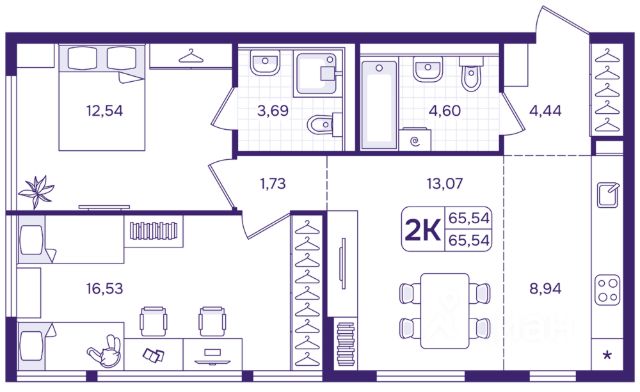 Воплощение уюта и функциональности для яркой, насыщенной жизни Просторная кухня-гостиная объединяет в себе место для семейных трапез и отдыха. Выход на компактную лоджию подарит возможность мгновенно окунуться в атмосферу комфорта и наслаждаться свежим воздухом Родительская спальня продумана до мелочей — здесь предусмотрено место под вместительный шкаф, чтобы уютное пространство способствовало полноценному отдыху Детская комната — настоящий островок творчества и гармонии. Здесь можно с комфортом разместить рабочую зону, пространство для отдыха и место под систему хранения, чтобы каждый день приносил радость открытий и развития Просторная прихожая обеспечивает порядок и удобство с первых шагов в квартире Два санузла — один с ванной и местом для стиральной машины, а второй с предусмотренным местом под душевую кабину — создают идеальные условия для ежедневного комфорта