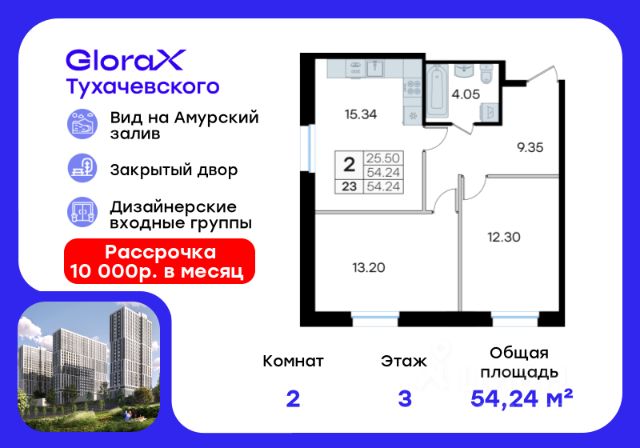 Продается 2-комн. квартира на 23-м этаже в жилом комплексе GloraX Тухачевского — современном проекте нового формата в престижном районе Владивостока. Общая площадь лота составляет 54,24 кв. м, из которых 25,50 кв. м отведено под жилую и 15,34 кв. м под кухонную зону. Номер квартиры - 224. Преимущества квартиры: двухкомнатная квартира; вид на море; высокий этаж; угловая. Преимущества проекта: • Панорамный вид на Амурский залив и зелёные сопки • Удачное расположение и транспортная доступность: Первореченский район, 20 минут до центра города • Закрытая охраняемая территория с доступом только для жителей • Эксклюзивное благоустройство: продуманное зонирование, игровые и спортивные площадки, арт-инсталляция, Тайный сад • Безбарьерная среда, видеонаблюдений, Wi-Fi на территории • Премиальный дизайн входных групп реcепшн и лаунж-зоной • Лапомойки, колясочные и туалеты на первом этаже • Подземный паркинг на 449 машиномест с доступом на лифте с жилых этажей • Индивидуальные кладовые на цокольном этаже от 2 до 10 м2 GloraX Тухачевского — это городское пространство нового формата, которое позволяет современным горожанам находить все необходимые атрибуты комфортной жизни внутри своего жилого комплекса. Весь комплекс спроектирован так, чтобы жить здесь было удобно и безопасно: светлые лаунж-зоны и ресепшн на входах в жилые корпуса, эксклюзивный дизайн мест общего пользования и придомовой территории, круглосуточная охрана, видеонаблюдение и даже детский сад в одном из корпусов все, что необходимо современному городскому жителю. GloraX Тухачевского находится в одном из самых престижных районов города с хорошей, давно сформировавшейся инфраструктурой и отличной транспортной доступностью. Отсюда легко добраться до центра города, других районов и даже пригорода как на собственном транспорте, так и на общественном. Квартал имеет прямой выезд на ул. Тухачевского, а рядом с комплексом расположена автобусная остановка на несколько маршрутов. Проект состоит из 3 монолитных корпусов, объединенных единым стилобатом. В комплексе предусмотрены: подземный паркинг с лифтом на жилые этажи, кладовые для хранения, благоустроенный двор без машин, детские и спортивные площадки, зоны для отдыха и прогулок. Эксклюзивный проект благоустройства территории разработан одной из лучших студий ландшафтного дизайна DEREVOPARK с фокусом на комфорт и удобство для всех жителей комплекса. Вся необходимая инфраструктура — магазины, школы, детские сады, остановки общественного транспорта — находится рядом. Узнайте подробности и подберите свою квартиру в GloraX Тухачевского — в отделе продаж уже сегодня. Цена указана при 100% оплате или стандартной ипотеке. Узнайте подробности в Отделе продаж.