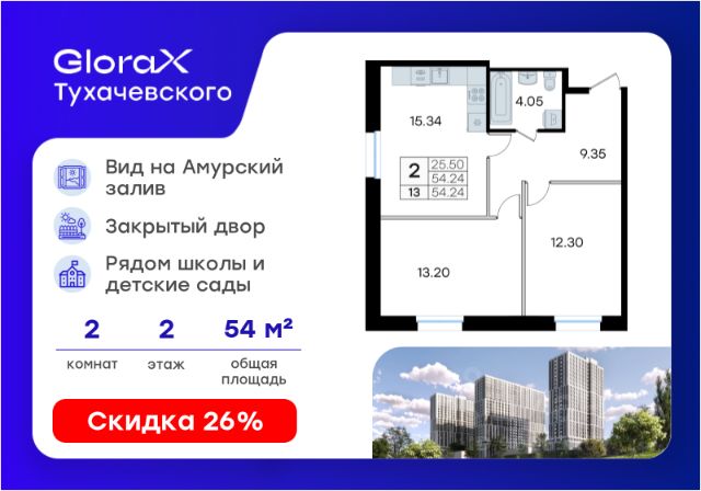 Строим Владивосток, каким он должен быть В чем уникальность R4? Мультиформатный жилой квартал с общей премиальной инфраструктурой В жилом квартале есть жилье разного уровня - от практичного "комфорта" и "комфорт-плюс" до квартир класса "бизнес" и даже "премиум". Поэтому архитектура, инженерное наполнение, благоустройство... вообще каждая деталь квартала, от детских площадок до отделки мест общего пользования - всё соответствует высоким требованиям покупателей. Но это общая инфраструктура. Доступная любому резиденту квартала, независимо от выбранной им квартиры. Рядом с кварталом R4 расположены новейшие жилые комплексы. Старого жилья там просто нет, каждый дом "с иголочки". Новые гладкие автодороги, торговые центры, детские сады и школы. Несмотря на обособленность территории, Зеленый угол обеспечивает легкий доступ ко всей инфраструктуре Владивостока. 2 минуты до детского сада 15 минут до Золотого моста 20 минут до ЖД вокзала 20 минут до Русского моста 45 минут до аэропорта Преимущества Прогрессивная архитектура, разработанная под ландшафт и рельеф участка Удобная и безопасная система передвижения внутри жилого квартала, минуя автомобильный трафик. Дети и взрослые не пересекают дорогу Собственный закрытый парк для жителей квартала "Дворы без машин", гриль-зоны, спортивные и детские площадки Соседский центр с кафе только для жителей квартала Две эксплуатируемые кровли, лаунж-зоны, коворкинг для жителей квартала Более 100 уникальных планировочных решений — двухуровневые квартиры, с отдельном входом и патио, с приватными террасами, двухэтажные со вторым светом, функциональные студии, евроформат с кухней гостиной, с рабочим кабинетом и др. Лобби с приятным дизайном и атмосферой дома Подземный паркинг, кладовые, колясочные и велосипедные Панорамные окна - увеличенные проемы, низкие подоконники Высота потолков до 4,5 м на первых жилых этажах Три варианта отделки: черновая, предчистовая и полный ремонт Автоматизированные системы учета коммунальных услуг Доступ к видеокамерам для всех жильцов квартала Собственная автомойка в жилом квартале 24/7 Подземный паркинг с лифтом до квартиры 2-комнатная квартира от застройщика в Приморском крае.