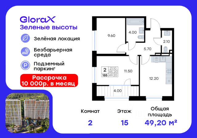 Продается 2-комн. квартира на 15-м этаже в жилом квартале GloraX Зелёные высоты — проекте в тихой зелёной локации. Общая площадь квартиры 49,20 кв. м, из которых 21,10 кв. м включая 21,10 кв. м жилого пространства и 12,20 кв. м кухни. Номер квартиры - 185. Преимущества квартиры: угловая 2 к.кв.; лоджия. Преимущества проекта: • Идеальное сочетание городской и загородной жизни • Сдаем в 2025 году • Уютный зелёный район с развитой инфраструктурой • Великолепные виды на Вечнозеленый сквер и лесопарк на 150 Га • Видеонаблюдение, IP-домофон, Wi-Fi на территории, • Дизайнерские входные группы • Безбарьерная среда, колясочные, туалеты на 1 этаже, лапомойки • Эксклюзивное благоустройство территории • Подземный паркинг на 235 машино-мест с лифтом на жилые этажи • Индивидуальные кладовые от 3 до 7 кв. м • Черновая отделка для реализации любых дизайнерских идей GloraX Зелёные высоты — современный жилой проект, сочетающий преимущества городской и пригородной жизни. Комплекс тщательно продуман для максимального удобства и обеспечения безопасности жителей. Квартал расположен в зеленом, живописном и активно развивающемся районе Зеленый Угол, вдали от серой массовой застройки. Жители GloraX Зелёные высоты смогут насладждаться прогулками в Вечнозелёном сквере или лесопарке. В непосредственной близости находятся остановки общественного транспорта и автомобильный подъезд со стороны Нейбута. Скоро также появится выездом на трассу Де-Фриз-Седанка, что обеспечит быстрый доступ в любую часть города и пригород. Проект включает 2 корпуса, каждый из которых спроектирован с акцентом на комфорт, безопасность и современный образ жизни. В комплексе предусмотрен подземный паркинг на 235 машиномест с доступом прямо с жилых этажей. Паркинг оборудован современными системами видеонаблюдения, контроля въезда-выезда и пожаротушения. Цокольный этаж здания отведен под индивидуальные кладовые площадью от 3 до 7 квадратных метров, которые можно использовать для хранения сезонных вещей. Доступ к кладовым - на лифте с жилых этажей. Территория жилого квартала благоустроена и включает игровые зоны и спортивные площадки для детей различных возрастных групп, уютные зоны отдыха со скамейками и универсальную воркаут-площадку для активного досуга. В шаговой доступности располагаются все необходимые объекты социальной инфраструктуры. Узнайте больше в отделе продаж — выберите свою квартиру в GloraX Зелёные высоты уже сегодня!