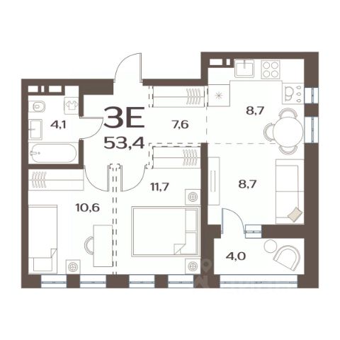 Идеальная квартира для молодой семьи Кухня-столовая 13,7 кв.м для семейных завтраков и ужинов Просторная родительская спальня 14,7 кв.м с выходом на лоджию, где можно наслаждаться свежим воздухом Уютная детская комната 11,3 кв.м для занятий учебой и отдыха Прихожая 4,8 кв.м с местом под шкаф-купе Ванная комната 4 кв.м в удобном расположении для всех членов семьи