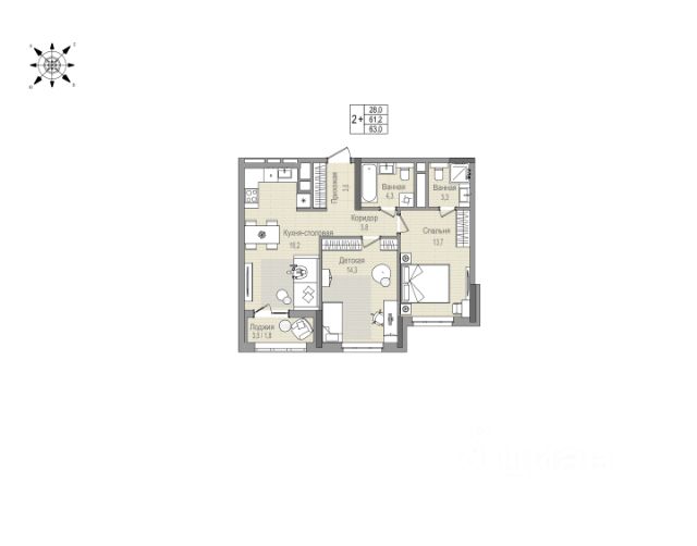 Идеальная квартира для молодой семьи Кухня-столовая 13,7 кв.м для семейных завтраков и ужинов Просторная родительская спальня 14,7 кв.м с выходом на лоджию, где можно наслаждаться свежим воздухом Уютная детская комната 11,3 кв.м для занятий учебой и отдыха Прихожая 4,8 кв.м с местом под шкаф-купе Ванная комната 4 кв.м в удобном расположении для всех членов семьи