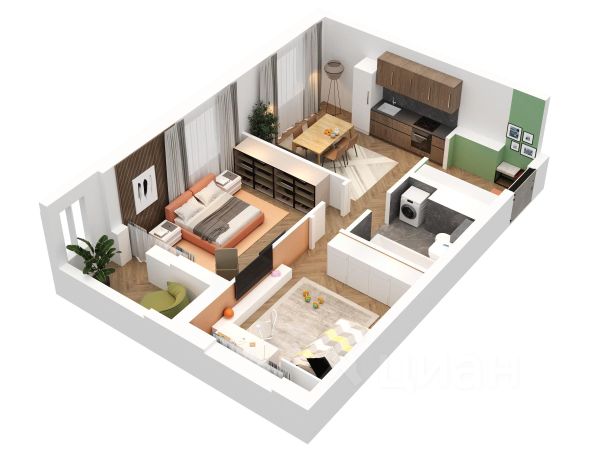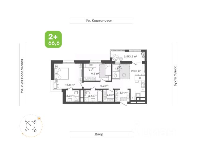 Уютное пространство для самостоятельной жизни Просторная прихожая 5,4 кв.м с местом для шкафа Кухня-столовая 16,7 кв.м место для ваших кулинарных экспериментов и отдыха за домашним кинотеатром Спальня 14,7 кв.м с выходом на лоджию, где можно наслаждаться свежим воздухом и красивым видом на окружающий пейзаж Гардеробная в спальне 2,5 кв.м позволит аккуратно разместить вещи, освободив место в комнате Ванная комната 5,5 кв.м с местом под стиральную машину