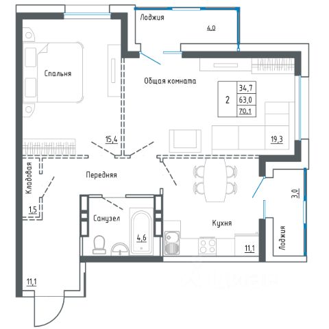 + Большая застекленная лоджия, два выхода (кухня, гостиная).