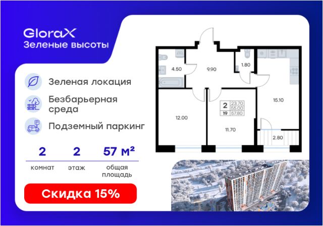 Продается 2-комн. квартира на 2-м этаже в жилом квартале GloraX Зелёные высоты — проекте в тихой зелёной локации. Общая площадь квартиры 57,80 кв. м, из которых 23,70 кв. м включая 23,70 кв. м жилого пространства и 15,10 кв. м кухни. Номер квартиры - 19. Преимущества квартиры: компактная евро-3; вид на лесопарк; лоджия. Преимущества проекта: • Идеальное сочетание городской и загородной жизни • Сдаем в 2026 году • Уютный зелёный район с развитой инфраструктурой • Великолепные виды на Вечнозеленый сквер и лесопарк на 150 Га • Видеонаблюдение, IP-домофон, Wi-Fi на территории, • Дизайнерские входные группы • Безбарьерная среда, колясочные, туалеты на 1 этаже, лапомойки • Эксклюзивное благоустройство территории • Подземный паркинг на 235 машино-мест с лифтом на жилые этажи • Индивидуальные кладовые от 3 до 7 кв. м • Черновая отделка для реализации любых дизайнерских идей GloraX Зелёные высоты — современный жилой проект, сочетающий преимущества городской и пригородной жизни. Комплекс тщательно продуман для максимального удобства и обеспечения безопасности жителей. Квартал расположен в зеленом, живописном и активно развивающемся районе Зеленый Угол, вдали от серой массовой застройки. Жители GloraX Зелёные высоты смогут насладждаться прогулками в Вечнозелёном сквере или лесопарке. В непосредственной близости находятся остановки общественного транспорта и автомобильный подъезд со стороны Нейбута. Скоро также появится выездом на трассу Де-Фриз-Седанка, что обеспечит быстрый доступ в любую часть города и пригород. Проект включает 2 корпуса, каждый из которых спроектирован с акцентом на комфорт, безопасность и современный образ жизни. В комплексе предусмотрен подземный паркинг на 235 машиномест с доступом прямо с жилых этажей. Паркинг оборудован современными системами видеонаблюдения, контроля въезда-выезда и пожаротушения. Цокольный этаж здания отведен под индивидуальные кладовые площадью от 3 до 7 квадратных метров, которые можно использовать для хранения сезонных вещей. Доступ к кладовым - на лифте с жилых этажей. Территория жилого квартала благоустроена и включает игровые зоны и спортивные площадки для детей различных возрастных групп, уютные зоны отдыха со скамейками и универсальную воркаут-площадку для активного досуга. В шаговой доступности располагаются все необходимые объекты социальной инфраструктуры. Узнайте больше в отделе продаж — выберите свою квартиру в GloraX Зелёные высоты уже сегодня!