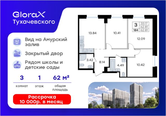 Продается 3-комн. квартира на 4-м этаже в жилом квартале GloraX Зелёные высоты — проекте в тихой зелёной локации. Общая площадь квартиры 62,60 кв. м, из которых 34,90 кв. м включая 34,90 кв. м жилого пространства и 10,40 кв. м кухни. Номер квартиры - 283. Преимущества квартиры: просторная 2 к.кв.; лоджия. Преимущества проекта: • Идеальное сочетание городской и загородной жизни • Сдаем в 2026 году • Уютный зелёный район с развитой инфраструктурой • Великолепные виды на Вечнозеленый сквер и лесопарк на 150 Га • Видеонаблюдение, IP-домофон, Wi-Fi на территории, • Дизайнерские входные группы • Безбарьерная среда, колясочные, туалеты на 1 этаже, лапомойки • Эксклюзивное благоустройство территории • Подземный паркинг на 235 машино-мест с лифтом на жилые этажи • Индивидуальные кладовые от 3 до 7 кв. м • Черновая отделка для реализации любых дизайнерских идей GloraX Зелёные высоты — современный жилой проект, сочетающий преимущества городской и пригородной жизни. Комплекс тщательно продуман для максимального удобства и обеспечения безопасности жителей. Квартал расположен в зеленом, живописном и активно развивающемся районе Зеленый Угол, вдали от серой массовой застройки. Жители GloraX Зелёные высоты смогут насладждаться прогулками в Вечнозелёном сквере или лесопарке. В непосредственной близости находятся остановки общественного транспорта и автомобильный подъезд со стороны Нейбута. Скоро также появится выездом на трассу Де-Фриз-Седанка, что обеспечит быстрый доступ в любую часть города и пригород. Проект включает 2 корпуса, каждый из которых спроектирован с акцентом на комфорт, безопасность и современный образ жизни. В комплексе предусмотрен подземный паркинг на 235 машиномест с доступом прямо с жилых этажей. Паркинг оборудован современными системами видеонаблюдения, контроля въезда-выезда и пожаротушения. Цокольный этаж здания отведен под индивидуальные кладовые площадью от 3 до 7 квадратных метров, которые можно использовать для хранения сезонных вещей. Доступ к кладовым - на лифте с жилых этажей. Территория жилого квартала благоустроена и включает игровые зоны и спортивные площадки для детей различных возрастных групп, уютные зоны отдыха со скамейками и универсальную воркаут-площадку для активного досуга. В шаговой доступности располагаются все необходимые объекты социальной инфраструктуры. Узнайте больше в отделе продаж — выберите свою квартиру в GloraX Зелёные высоты уже сегодня! Купить 3-комнатную квартиру до 10 млн. рублей в Владивостоке.
