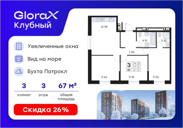 DNV-07-01-02-005-005 Просторная 3-комнатная квартира евроформата с повышенной инсоляцией в жилом комплексе "ДОМ на Востоке". Срок сдачи 3 кв. 2027 г. Монолитный дом. "ДОМ на Востоке" жилой квартал с авторской архитектурой от известного бюро KAMEN, благоустроенной территорией и собственной развитой инфраструктурой. Это флагманский проект от государственного застройщика ДОМ.РФ Девелопмент, расположенного в сердце живописной бухты Патрокл. Проект находится в перспективном, быстроразвивающемся районе города со всей инфраструктурой на берегу залива. Всего 8 минут пешком и вы на Леопардовой набережной совершаете променад или любуетесь завораживающими закатами и рассветами. До центра города и крупных торговых центров легко добраться за 20 минут на автомобиле. Преимущества квартиры - Современная планировка - Высокий потолок 2,9 м - Повышенная инсоляция - Гардеробная комната Отделка: Квартира сдается в черновой отделке. Инфраструктура На первых этажах домов будет все необходимое для жизни: магазины, кафе, аптеки, салоны красоты и многое другое. А для семей с детьми предусмотрены детские сады, безопасные игровые площадки и игровые комнаты. Паркинг: подземный отапливаемый с видеонаблюдением Для удобства жителей комплекса предусмотрен теплый паркинг в доме. Теперь не придется искать место для парковки, а также чистить автомобиль от снега или долго прогревать его в холодное время года. В паркинге также расположены кладовые помещения для хранения сезонных вещей и спортивного инвентаря. Условия покупки Продажа от надёжного государственного застройщика ДОМ.РФ Девелопмент с использованием эскроу-счетов. 100% оплата или ипотека. Сейчас действуют особые предложения по льготной ипотеке на период строительства.