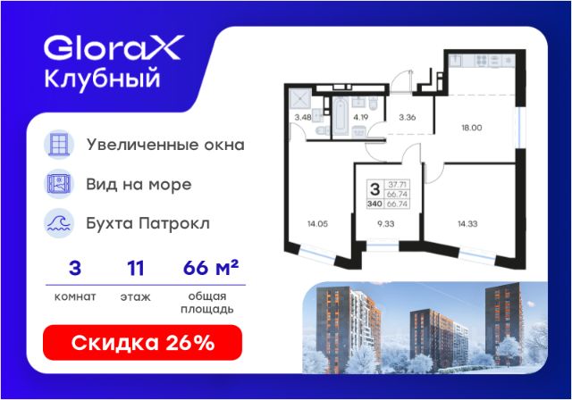 • ✓ В базе Циан 18 3-комнатных квартир на 11 этаже в микрорайоне Патрокл в городе Владивосток