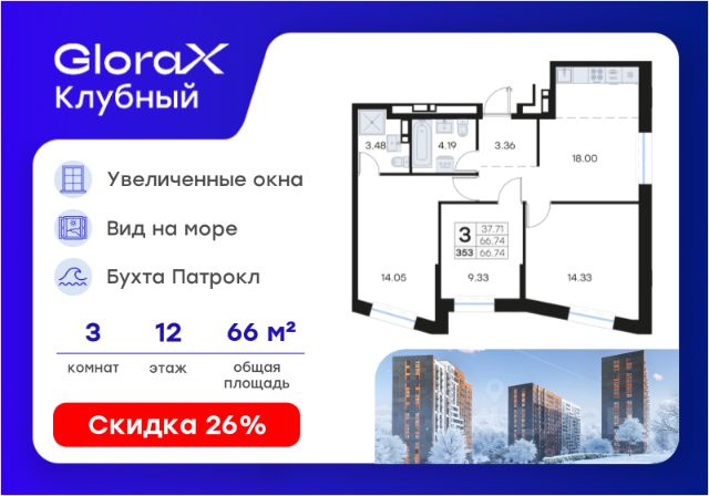 • ✓ В базе Циан 18 3-комнатных квартир на 12 этаже в микрорайоне Патрокл в городе Владивосток