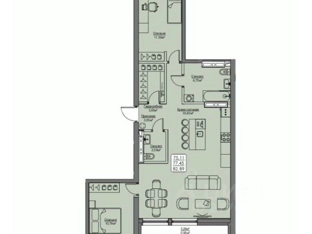 Идеальная квартира для молодой семьи Кухня-столовая 17,1 кв.м для семейных завтраков и ужинов Просторная родительская спальня 11,9 кв.м с выходом на лоджию, где можно наслаждаться свежим воздухом Уютная детская комната 10,9 кв.м для занятий учебой и отдыха Прихожая 3,2 кв.м с местом под шкаф-купе Ванная комната 5 кв.м в удобном расположении для всех членов семьи