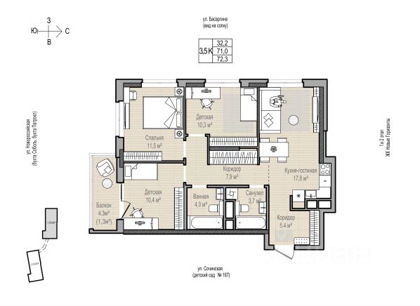 Вид на морские бухты и закаты Коридор 5,4 кв.м. с местом под шкаф-купе для утренних прощаний и радостных вечерних встреч Кухня-гостиная 17,8 кв.м. для самых смелых кулинарных экспериментов Раздельные санузел 3,7 кв.м. и ванная 4 кв.м. для удобства большой семьи Одна детская 10,3 кв.м. с видом на лесной массив с пространством для учебы и игр Вторая детская 10,4 кв.м. с выходом на балкон и видом на морские пейзажи Спальня 11,5 кв.м. для тихого уединения и наслаждения видами на природу, море и закаты