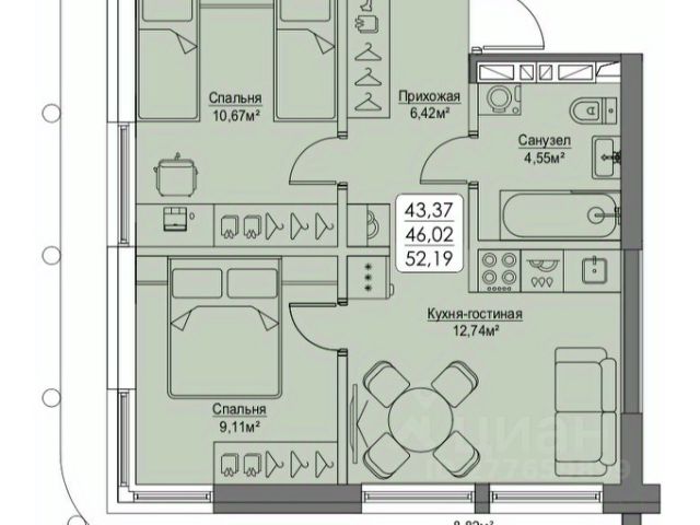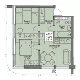 Комфортное пространство для жизни и отдыха Кухня-столовая 17,1 кв.м это идеальное место для приготовления вкусной еды и уютных посиделок за столом в кругу семьи и друзей Просторная прихожая 4,6 кв.м с гардеробной 3 кв.м, где удобно организовать хранение вещей Спальня 12,1 кв.м с выходом на лоджию - это уютный уголок, где можно наслаждаться утренним кофе с прекрасным видом Ванная 4,3 кв.м с местом под стиральную машину