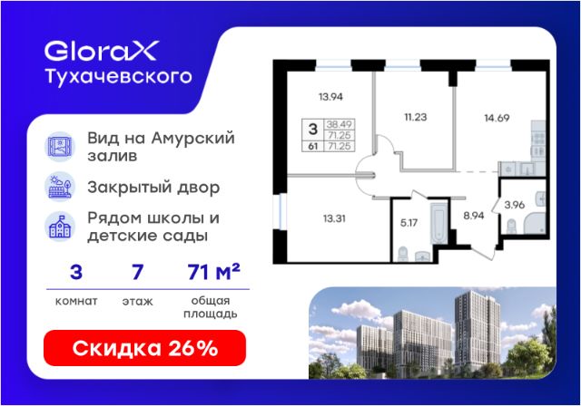 Продаётся 3-комн. квартира площадью 87,3 кв.м на 7 этаже 17 этажного дома (Корпус 3, Секция 3) проекта ПИК Борисенко 48. Светлый просторный подъезд на уровне земли, функциональная планировка, большие окна, предчистовая отделка. "Борисенко 48" - небольшой квартал в Первомайском районе, в 15 минутах пути на автомобиле от центра Владивостока. С верхних этажей откроется живописный вид на город и сопки. В проекте всего четыре дома и подземный паркинг, в который можно будет спуститься на лифте. Высота домов от 17 до 30 этажей - благодаря переменной этажности солнце будет лучше освещать двор и квартиры. На первых этажах откроются пекарни, кафе, магазины и другие сервисы - это удобно, когда внезапно закончится хлеб или захочется побаловать себя горячим кофе. Из каждого дома будет выход в уютный двор-парк - это закрытая территория для отдыха, где растут цветы и деревья, оборудованы детские и спортивные площадки. Рядом с "Борисенко 48" появится также детский сад для 150 малышей. В пешей доступности есть всё необходимое для комфортной жизни: школы, детские сады, поликлиника и магазины. До крупных торговых центров "Калина Молл" и "Луговая", а также супермаркета "Реми" - всего 5 минут на машине. А до озера на Сафонова, которое отлично подходит для прогулок и отдыха, можно дойти пешком за 9 минут. Живописная Леопардовая набережная - в 10 минутах на автомобиле. Из квартала можно будет выехать как на улицу Борисенко, так и на улицу Сафонова. Артикул 918676 (Застройщик ООО "СЗ "Юстина")