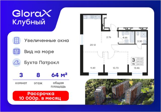 Продается 3-комн. квартира на 8-м этаже в квартале GloraX Клубный. GloraX Клубный - уникальный видовой проект с выделяющейся архитектурой в развитом районе Владивостока. Общая площадь лота составляет 66,74 кв. м, из которых 37,71 кв. м отведено под жилую и 18,00 кв. м под кухонную зону. Номер квартиры - 301.