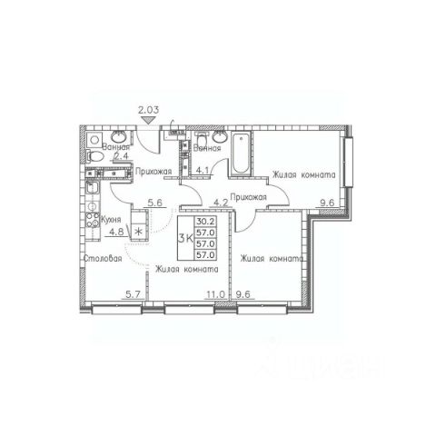 Квартира удобной планировки, общая площадь квартиры 62,3 кв.м.: просторная гостиная, совмещенная с кухней; две изолированные спальни площадью 13,7 и 12 кв.м.; совмещенный санузел площадью 7,2 кв.м., гардеробная 2,1 кв.м., коридор, прихожая, застекленный балкон. Окна выходят на две стороны дома, что обеспечивает хорошее естественное освещение в течение дня.