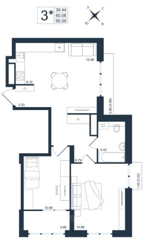 Продаётся 3-комнатная квартира в строящемся доме (Дом 1), срок сдачи: III-кв. 2027, общей площадью 65.09 кв.м., на 11 этаже. Новый жилой комплекс "Архитектор" от группы компаний "Девелопмент-Юг" расположен по адресу: г. Владивосток, по ул. Бежецкая.