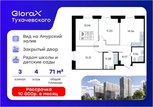 Продается 3-комн. квартира на 4-м этаже в жилом комплексе GloraX Тухачевского — современном проекте нового формата в престижном районе Владивостока. Общая площадь лота составляет 71,12 кв. м, из которых 38,45 кв. м отведено под жилую и 14,66 кв. м под кухонную зону. Номер квартиры - 31. Преимущества квартиры: трехкомнатная квартира; угловая; 2 санузла. Преимущества проекта: • Панорамный вид на Амурский залив и зелёные сопки • Удачное расположение и транспортная доступность: Первореченский район, 20 минут до центра города • Закрытая охраняемая территория с доступом только для жителей • Эксклюзивное благоустройство: продуманное зонирование, игровые и спортивные площадки, арт-инсталляция, Тайный сад • Безбарьерная среда, видеонаблюдений, Wi-Fi на территории • Премиальный дизайн входных групп реcепшн и лаунж-зоной • Лапомойки, колясочные и туалеты на первом этаже • Подземный паркинг на 449 машиномест с доступом на лифте с жилых этажей • Индивидуальные кладовые на цокольном этаже от 2 до 10 м2 GloraX Тухачевского — это городское пространство нового формата, которое позволяет современным горожанам находить все необходимые атрибуты комфортной жизни внутри своего жилого комплекса. Весь комплекс спроектирован так, чтобы жить здесь было удобно и безопасно: светлые лаунж-зоны и ресепшн на входах в жилые корпуса, эксклюзивный дизайн мест общего пользования и придомовой территории, круглосуточная охрана, видеонаблюдение и даже детский сад в одном из корпусов все, что необходимо современному городскому жителю. GloraX Тухачевского находится в одном из самых престижных районов города с хорошей, давно сформировавшейся инфраструктурой и отличной транспортной доступностью. Отсюда легко добраться до центра города, других районов и даже пригорода как на собственном транспорте, так и на общественном. Квартал имеет прямой выезд на ул. Тухачевского, а рядом с комплексом расположена автобусная остановка на несколько маршрутов. Проект состоит из 3 монолитных корпусов, объединенных единым стилобатом. В комплексе предусмотрены: подземный паркинг с лифтом на жилые этажи, кладовые для хранения, благоустроенный двор без машин, детские и спортивные площадки, зоны для отдыха и прогулок. Эксклюзивный проект благоустройства территории разработан одной из лучших студий ландшафтного дизайна DEREVOPARK с фокусом на комфорт и удобство для всех жителей комплекса. Вся необходимая инфраструктура — магазины, школы, детские сады, остановки общественного транспорта — находится рядом. Узнайте подробности и подберите свою квартиру в GloraX Тухачевского — в отделе продаж уже сегодня. Цена указана при 100% оплате или стандартной ипотеке. Узнайте подробности в Отделе продаж.
